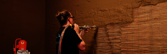 Lehm mit Putzmaschine auftragen auf ökologischer Innendämmung mit Wandheizung
