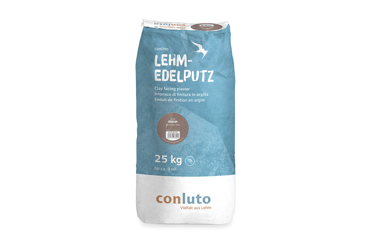 conluto Lehm-Edelputz ist eine farbige, dünnlagige Lehmmischung für die kreative Innenraumgestaltung mit und ohne Effektmaterialien. Diese können variabel beigefügt werden.