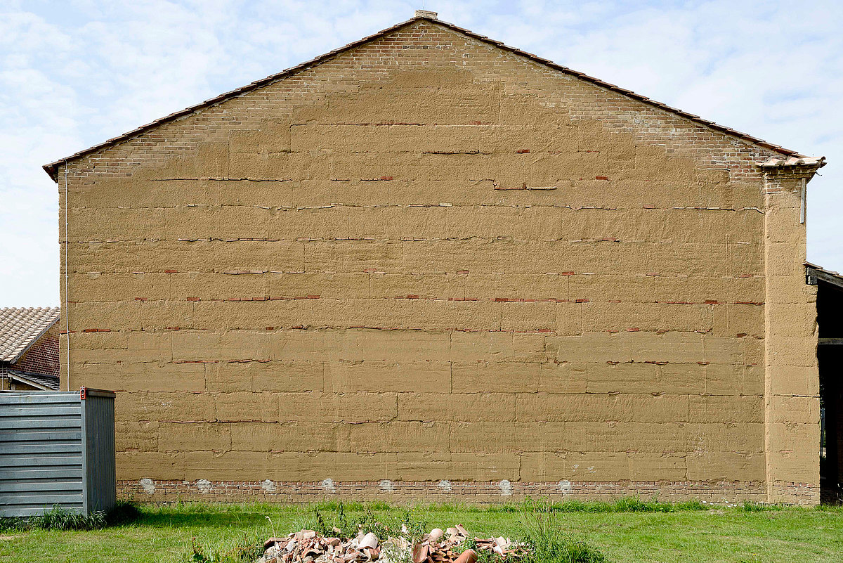 Die Haupttragwände sind zwei röm. Fuß dick (1 röm. Fuß = 296,35 mm) stark (also ca. 60 cm). Es wurden insgesamt ca. 540 m³ conluto Stampflehm verarbeitet. Als oberer Abschluss der Stampflehmwände wurden 45 cm (1½ röm. Fuß) gebrannte Ziegel aufgemauert, wie vom röm. Architekten Vitruv in seinem Buch beschrieben. Die Fachwerkwände (Zwischenwände und Schuppen) wurden mit Flechtwerk und Lehmbewurf hergestellt. Hier wurde ca. 45 m³ Lehm der Firma conluto verarbeitet.