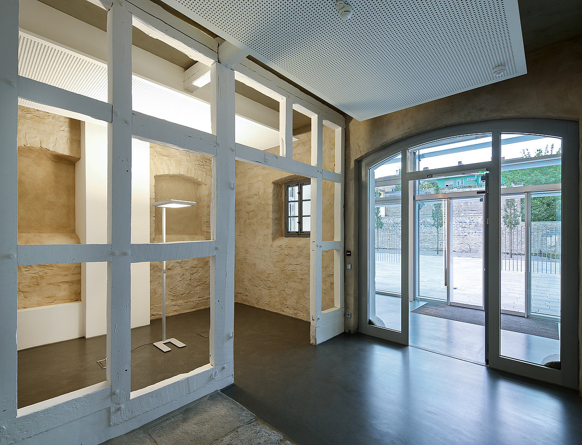 Für die Innenseiten der Außenwände brachte man ca. 300 m² conluto Innendämm-System ein - bestehend aus conluto Holzfaserdämmplatten und conluto Lehmputz. Die innenliegenden Wände und Decken wurden ebenfalls mit conluto Lehm verputzt. Insgesamt verbaute man ca. 21 to Lehmputz. Als Oberflächenfinish wählte die VHS für Wände und Decken den Lehm-Edelputz Farbton Altweiss.